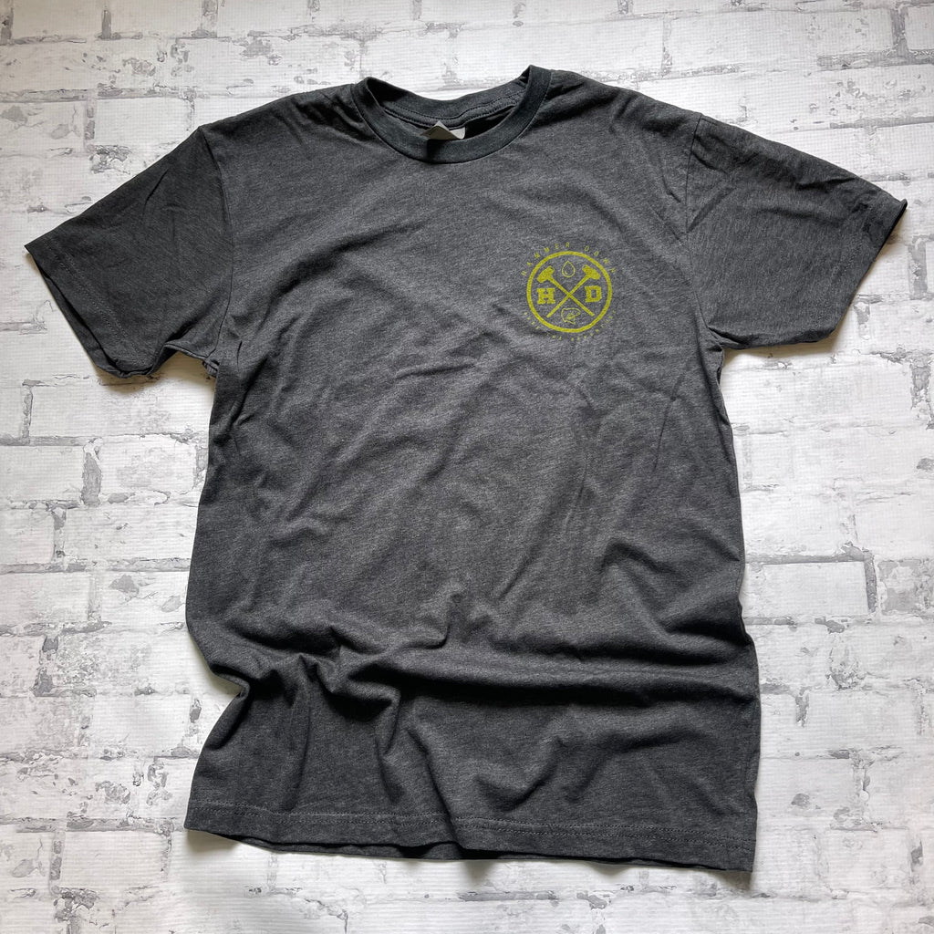 This soft short sleeve t-shirt has always been one of best sellers!! It features our Hammer Down Original Logo Design as a small left chest print with the Hammer Down "Water Man" Design as a back print. Available in Heather Charcoal as shown and also look for other colors on our site. Unisex Sizes Small to 3XL