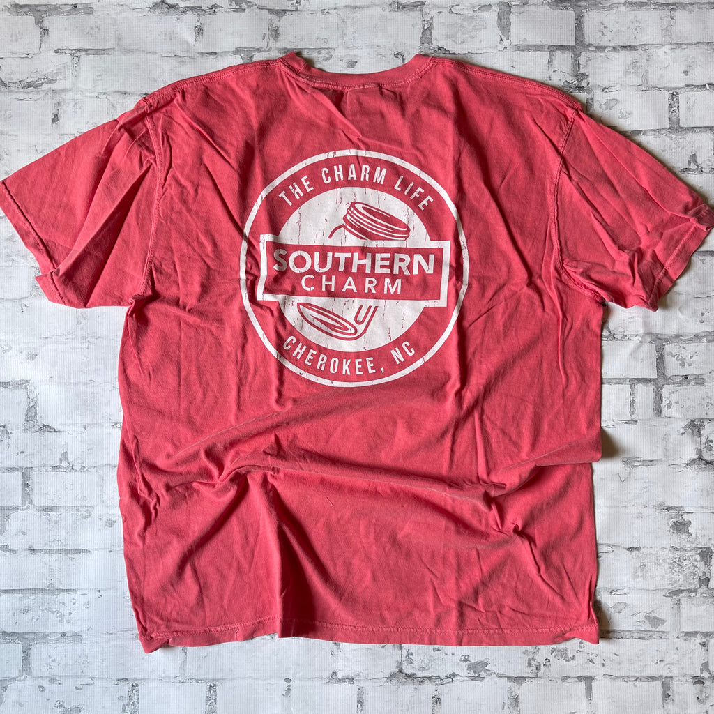 This soft comfort colors short sleeve t-shirt has always been one of best sellers!! It features our Southern Charm Original Logo Design as a small left chest print with the Southern Charm "70s" Design as a back print. Available in Watermelon as shown and also look for other colors on our site. Unisex Sizes Small to 3XL